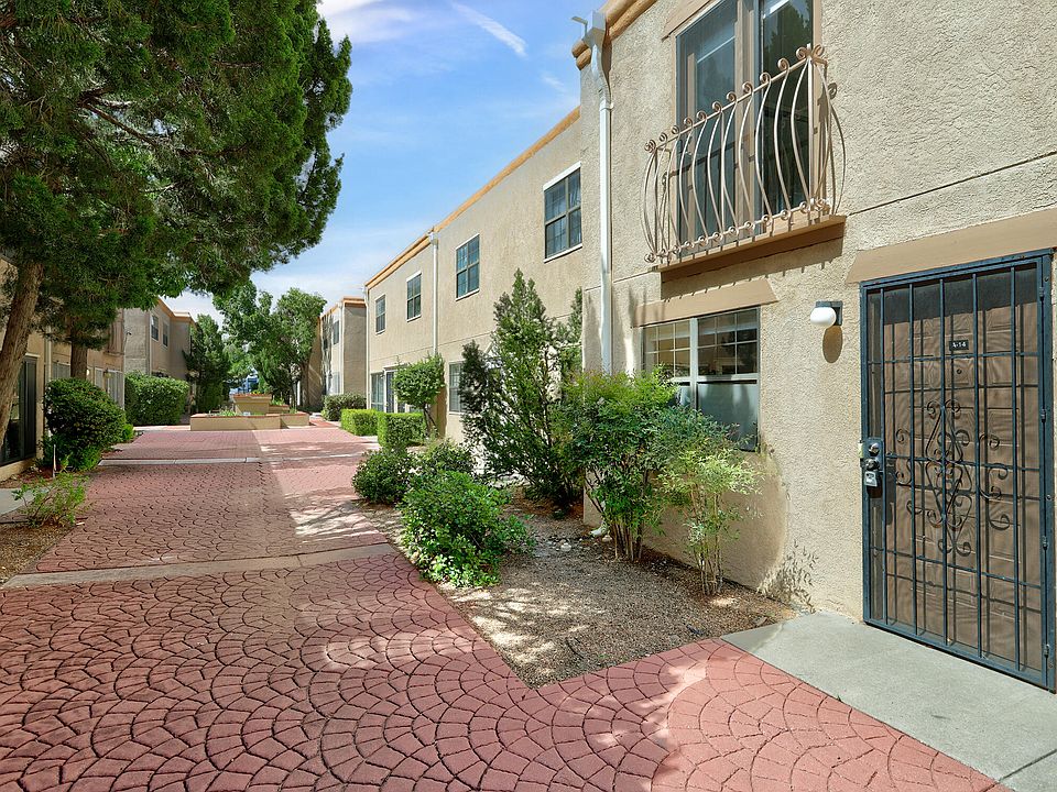 Adorable, well taken care of, updated condo in a remarkably convenient location. Superb solid concrete construction designed to be energy efficient and soundproof. This stylish, modern two bedroom unit with 2.5 bathrooms features a warm and inviting living room with a wood burning fireplace. Cozy kitchen with a dining area. Spacious bedrooms upstairs, each featuring their own private bathrooms. Cooling system upgraded to refrigerated air! Close to I40, shopping, restaurants, breweries, medical facilities, gyms, Ladera Golf Course and nearly everything else. HOA covers water, sewer, roof, stucco, and additional expenses and maintenance costs for the condos. See it, love it, own it!