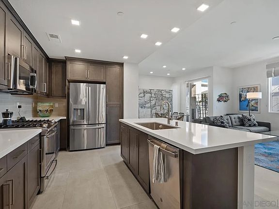 Rare Modern luxury Top Level Condo located in Bressi Ranch. A perfect blend of comfort and style as you enter this spacious 3 bed/2 bath condo. An abundance of natural light that fills the open living spaces. The well-appointed chef's kitchen boasts stainless steel appliances, quartz countertops, and custom cabinetry, providing the perfect setting for culinary enthusiasts. The adjoining dining area seamlessly flows into the inviting living room, creating an ideal space for entertaining guests or enjoying quiet evenings at home. The primary suite is a true retreat, featuring a generous walk-in closet and an en-suite bathroom with a luxurious custom walk-in shower. The secondary bedrooms are equally charming, offering versatility as a guest room or a home office. Both bedrooms showcase large windows, framing captivating views of the surrounding landscape and pool. The residence is adorned with high-end finishes and thoughtful details throughout, including Large format tile floors, custom fireplace, upgraded plush carpeting and elevator. A large private balcony provides a tranquil outdoor space to unwind and take in the breathtaking sunsets. Beyond the allure of the home itself, residents enjoy access to a host of community amenities. Dive into the sparkling pool, tot lot or stay active at the bocce court. The lush landscaping and well-maintained common areas create an inviting atmosphere for outdoor gatherings, BBQ's and leisurely strolls. A convenient shopping and restaurant center is only a stone throw away ensuring that daily needs are met with ease. Paid Solar included.