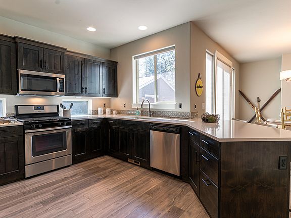 Lovely Pahlisch Homes townhome in desirable Stonegate Community; impeccably maintained and lightly lived in as prime vacation spot. Home feels and smells brand new and is a great place to making memories in Central Oregon. Great room floor plan with 3 bedrooms, 2 bathrooms, modern colors, coffered ceilings, quartz counters, stainless steel kitchen appliances, eating bar, custom desk in office niche, luxury plank flooring w/ carpet in bedrooms, and gas fireplace to warm cool nights. Attached 2 car garage with small work area, and fully fenced backyard featuring a landscaped courtyard area where you can sit around the fire pit and enjoy the natural forested area behind. This townhome can be sold turnkey including all appliances. The location will appeal to everyone with its easy and fast proximity to Bend and community amenities including park, pool, playground, and paved trail system. Make this home yours today!