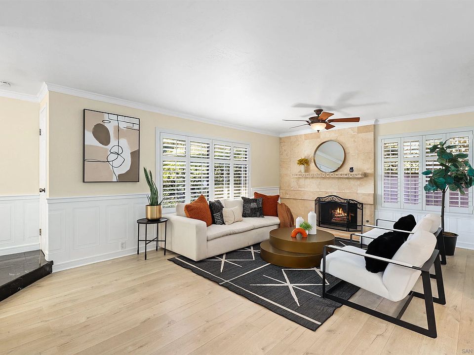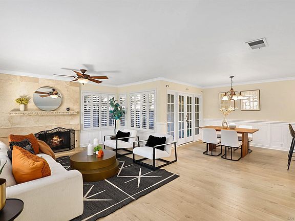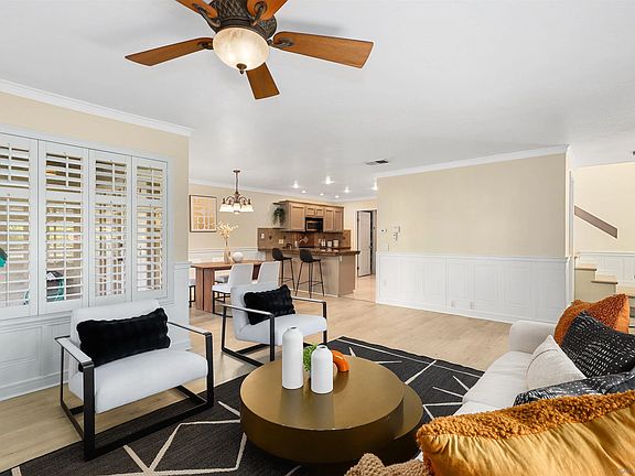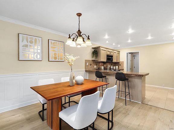 Welcome to this gorgeous Mission Valley townhome, located in a peaceful, park-like complex with a prime location close to everything you need! The formal entry opens to an inviting, open-concept living space with elegant shuttered windows, crown molding, and a seamless flow between the living, dining, and kitchen areas. The spacious kitchen features granite countertops, recessed lighting, stainless steel appliances, and ample cabinet space, with a convenient eat-at counter perfect for casual dining. You'll also enjoy direct access to the kitchen from the attached 2-car garage for added convenience. Upstairs, you'll find three beautifully appointed bedrooms, including a spacious primary suite offering generous closet space and a private balcony with serene views of the lush landscaping and sparkling pool area. The well-maintained community amenities include a pool for relaxation and enjoyment. This townhome is ideally located near a wide array of shopping, dining, and entertainment options, with easy access to Downtown and the beaches, making it the perfect spot for both work and play. Don’t miss your chance to call this charming townhome your own!