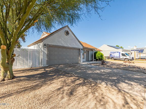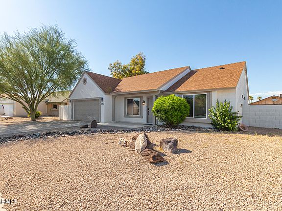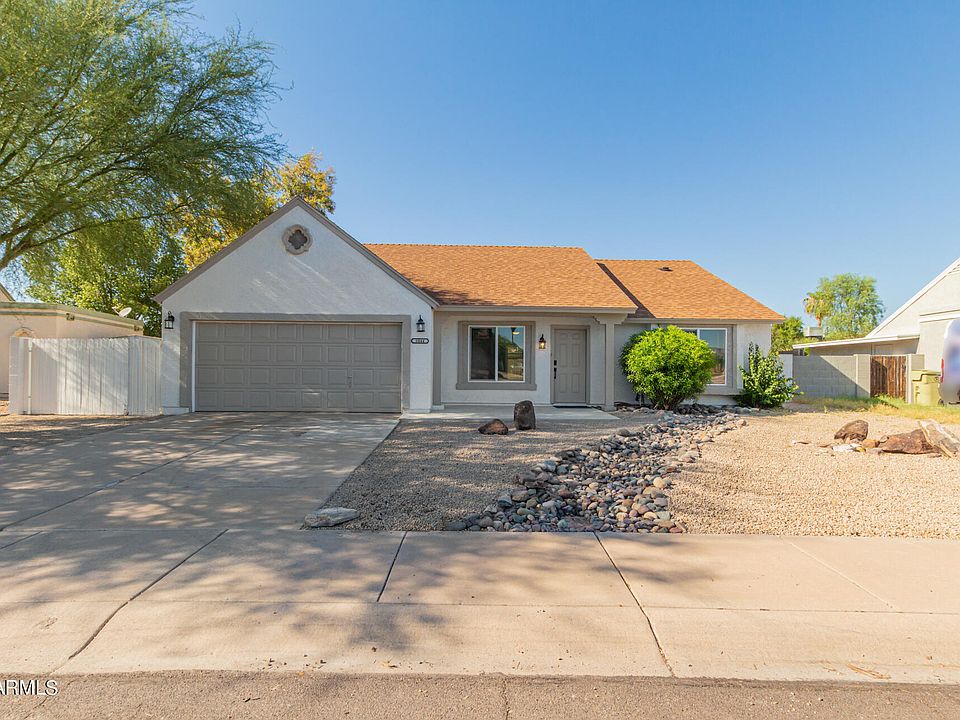 Come see this highly remodeled beauty now available! Nestled on a HUGE LOT. It offers 2 beds, 2 baths, a 2 car garage, RV gate, great curb appeal, and dry creek landscaping. As you step in, you are greeted by vaulted ceilings, taupe paint tones, thick baseboards, updated lighting/fixtures, and wood-like tile flooring t/out the home. Great open living room floor plan flows into the dining, kitchen, and glass door to the back great for entertaining. Your new kitchen features built-in appliances, white cabinetry, white granite counters, a glossy tile backsplash, and a breakfast bar w/cute drop lighting. Main bedroom has a closet and modern bath w/sleek black hardware. Secondary bedroom w/window seating! The huge backyard offer tons of potential to get creative. Come meet your new home today!