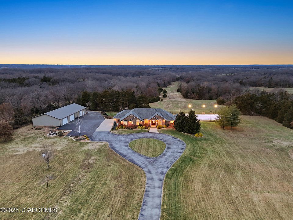 A Premier Luxury Estate on 52.32± Acres — Resort Amenities, Grand Presence, Total Privacy Perfectly positioned behind a wide paved circle driveway, this impressive 5,600 sq. ft. residence announces itself with estate-level scale, beautifully manicured landscaping, and a striking front elevation that sets the tone for one of the most extraordinary properties in Mid-Missouri. The moment you arrive, the setting feels private, polished, and purposeful—blending refined residential living with resort-quality outdoor amenities across 52.32± acres. Security is enhanced by a wired in-ground driveway alarm and full exterior camera system.