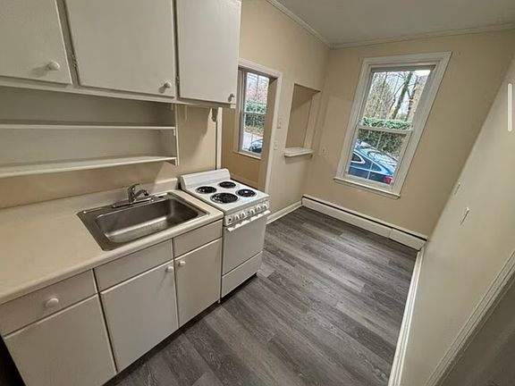 This apartment offers a functional layout consisting of a spacious living room, a bright kitchen with ample cabinetry and counter space and built-in shelving. The bedroom provides generous space with closet. The apartment is finished with updated flooring throughout, large windows for abundant natural light, and baseboard heating. A private bathroom is included.