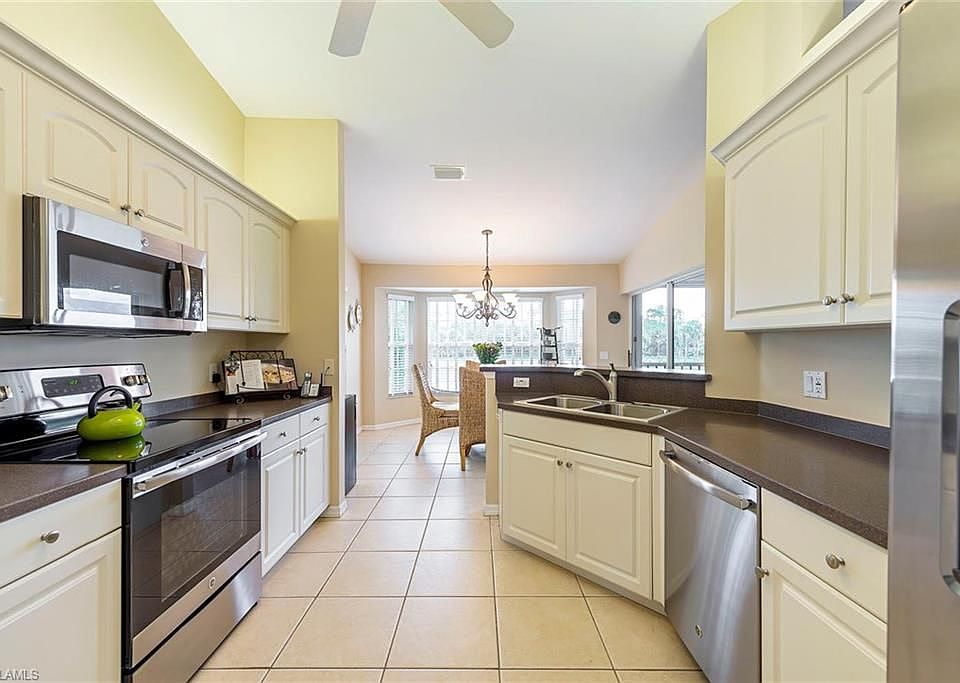 C.13932 - Lovely 2nd floor corner residence with new stainless steel appliances, white raised panel kitchen cabinetry, new carpeting, updated lighting fixtures and fans, freshly painted, electric storm shutters on tiled lanai, tiled main living area, functioning alarm system and the list goes on! Fully furnished. Gorgeous golf course views and convenient location across from the community pool and clubhouse. Enjoy the waterfall entrance to this lovely neighborhood with wide streets and beautiful landscaping on the large medians. Long driveway and ample parking available. The Strand has its own Publix grocery store, salons and restaurants at the main entrance. It is also very convenient to local beaches as well as the Mercato Center, Waterside Shops and Coconut Point shopping center. The Strand residents have the convenience of using the Strand north gate that leads to Livingston Road as an additional option from the main gate off Immokalee Road. Half price golf membership available currently. Agents see remarks.