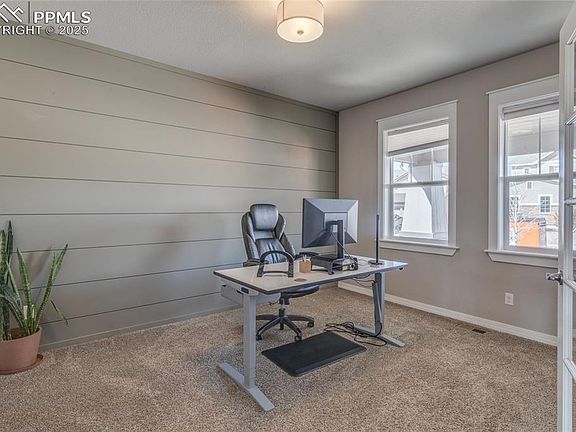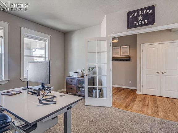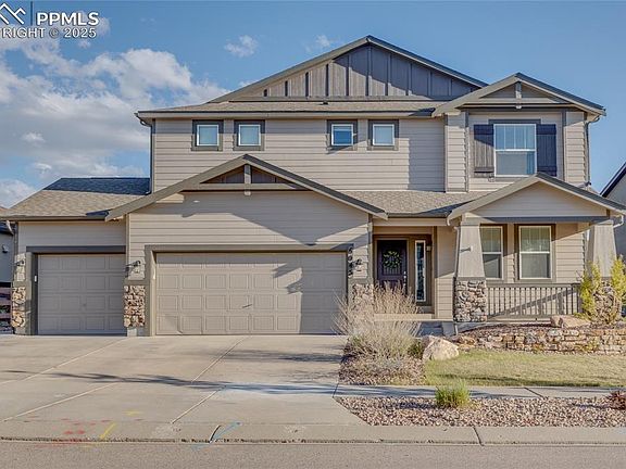 Superb location, a fantastic floor plan and the icing on the cake… glorious Pikes Peak views from the deck and the master bedroom! Classic, craftsman architecture with an ever popular front porch make this a “10” for curb appeal and desirability, a place you can be proud to call home! The great room is an entertainers dream where hosting large gatherings is a piece of cake… there’s an expansive breakfast bar, a dining nook, living room comfort or shuttle your guests outside for fresh air and to drink in the majestic mountain views via the walk out to the back deck. Wide plank natural wood flooring flows from entry, formal dining room and then to kitchen and dining nook. Perfectly situated, near the front entry, for workday privacy is a generously sized home office with French doors - perfect for the little ones, or furry friends, to peer in and be sure you’re being productive! At the light and bright living room you’ll be drawn to the focal point of the west wall - custom cabinetry, built-in book shelves, gas fireplace enhanced by custom molding/mantel and a bench seat. The kitchen is replete with copious counter top (quartz) and cabinet space, a pantry and recessed/pendant lighting. Yes, you can have your cake, and eat it too!