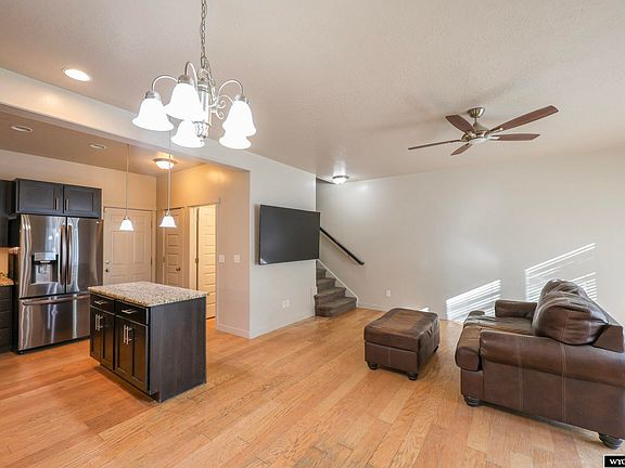 Discover this modern townhouse that blends style, comfort, and affordability! Enjoy low-maintenance living with a thoughtful design and spacious layout. Step inside to soaring 9-ft ceilings and an open-concept living and dining area. Rich wood flooring flows throughout the main level, adding warmth and elegance. The kitchen is a true showstopper, featuring dark cherry cabinets, sleek granite countertops, a versatile island illuminated by pendant lighting, a built-in wine rack, pantry, and stainless-steel appliances. The dining area shines under a charming chandelier, while the expansive living room is filled with natural light from tall windows. A convenient half-bathroom completes the main floor. Upstairs, all three bedrooms offer comfort and privacy. The impressive primary suite includes a cozy alcove—perfect for a reading nook or sitting area—a spacious walk-in closet, and an en-suite bath with generous counter space and a sleek walk-in shower. A dedicated laundry room with shelving adds practicality, while the versatile loft area at the top of the stairs makes an ideal home office or study space. Outside, enjoy a beautifully landscaped front yard maintained by the HOA, complete with a lush lawn, shrubs, and sprinkler system. The attached, finished garage provides extra storage and convenience. This prime location offers quick access to the Sweetwater Events Complex, White Mountain Golf Course, and endless outdoor adventures at White Mountain. For more information, contact: Jannel Fossen, AAA Properties, LLC (307) 389-0903
