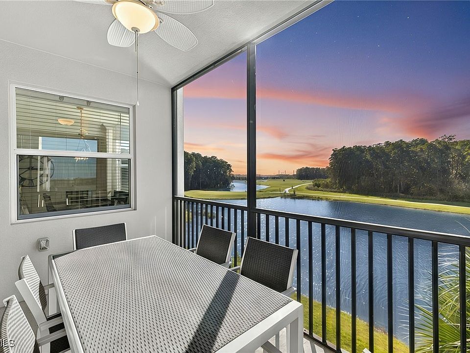 Here's your opportunity to embrace year-round golf within The National because this unit has the GOLF MEMBERSHP INCLUDED! Just bring yourself and your suitcase because this home is being sold turnkey-furnished. This is known as the "Birkdale" layout. This model comes with 2 bedrooms, 2 bathrooms, about 1,200 square feet of living space, an exterior storage unit AND a 1-car covered parking space. Additionally, this unit is accessible by the stairs or the common elevator. Walking inside and through the main hallway, you'll head right into your open kitchen which overlooks the living room and lanai. Finishes included in your main living spaces include everything from sleek quartz countertops with an oversized island, stainless steel appliances, crown molding, tile flooring, white cabinetry, and updated ceiling fixtures. With bay windows in the eat-in kitchen and sliding glass doors in the living room, you have the luxury of enjoying golf course & water views without even stepping outside! Outside, you have your very own screened-in lanai with panoramic views. Views that are hard to beat. Sellers also added a ceiling fan out there for additional cooling! Back on the opposite (entry) side of the condo, you have your 2 spacious bedrooms and bathrooms. Your primary bedroom offers a large walk-in closet, linen closet, and a beautifully tiled walk-in shower while your guest bedroom has a closet and it's own nearby bathroom. It's meticulously maintained and it's move-in ready! Outside of your home and within the gates of The National Golf & CC, boasts an 18-hole championship golf course, a large resort-style pool, a Chickee Bar, 6 Har-Tru tennis courts, 8 pickleball courts, and 2 bocce ball courts. Living here means more than just residing—it's a vibrant lifestyle and experience. Outside of the gates, you can enjoy North & South Parks, a water park, Ave Maria University events, local dining, shopping and so much more! Come experience everything you need in the fastest growing area in Naples!