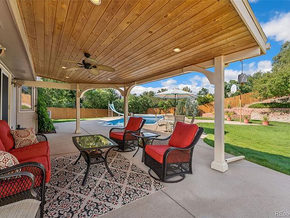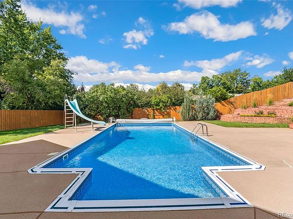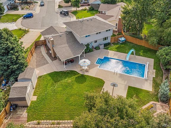 *Freshly painted 2nd level* Southern facing driveway. perfect for winter. Incredible opportunity to own this 2-story gem with an in-ground pool on a desirable cul-de-sac in Centennial! An expansive covered front porch provides an inviting welcome to functional open floor plan with both formal and informal living spaces waiting inside. Enjoy an abundance of natural light, gleaming hardwood floors in the formal rooms, vaulted ceilings & cozy fireplace with new insert in the family room, and a crisp and clean neutral color palette. Home chefs will love the recently updated spacious kitchen with ample warm wood cabinetry with drawer pullouts, a trash & recycle cabinet, drawers for pots and pans, under cabinet lighting, 5-burner gas range, and plenty of sleek granite countertops for easy meal prep. Charming bay window in the eat-in nook overlooks the pretty backyard. Upstairs finds four generous-sized bedrooms including the primary with dual closets and en-suite bath with a soothing jetted tub ideal for relaxing after a long day. More living space found in the basement with a versatile flex space that makes a great home gym or place room. Incredible private backyard oasis with your very own sparkling in-ground pool! The pool has a new liner, sand filter, and winter and solar summer covers so you can enjoy the pool expense-free for many years! You’ll also love the covered patio with charming wood plank ceiling and ceiling fan to sit back and unwind as you take in the peaceful yard or watch the family swim! New water heater in 2020! Ideal location with the Highline Canal across the street that offers miles of nature trails to enjoy! Also close to two grocery stores, Koelbel Library, and ample shops and dining. Award-winning Littleton Schools! This home is a must-see and ready for you to call it yours!