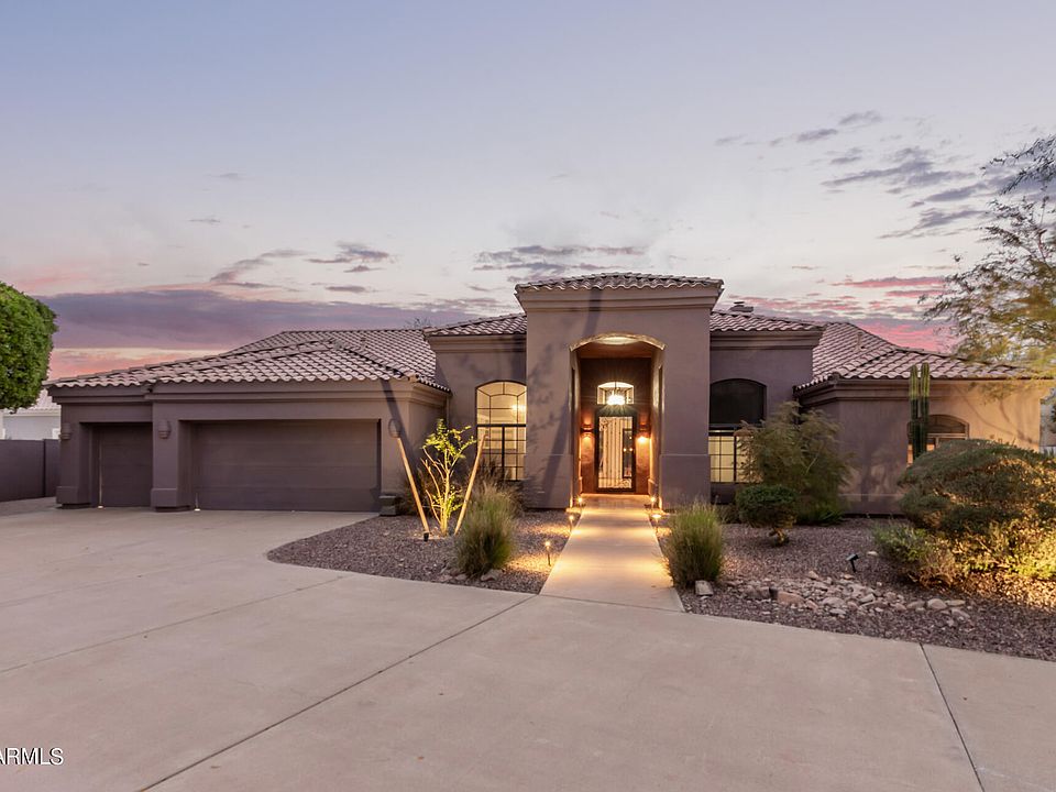 Presenting an exquisite residence nestled against a picturesque mountain backdrop within a serene cul-de-sac! This home boasts a 3-car garage with an extended driveway, surrounded by a desert landscape adorned with trees. Step inside to discover a luminous and expansive living/dining area featuring vaulted ceilings, a media niche, a charming fireplace, a wet bar, and multiple sliding glass doors that open to a welcoming back patio.