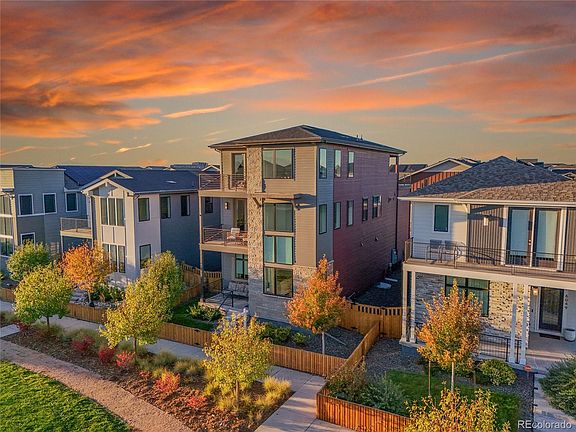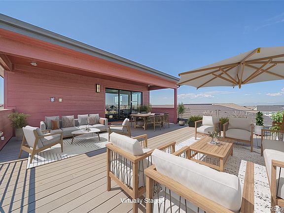REMARKABLE PRICE for this rare 4-bed, 4-bath, 3-story home (+ basement) with panoramic views of Denver and the entire Front Range—set in Painted Prairie, the award-winning community recently named Community of the Year by the Homebuilder's Association. This is one of the only homes in the neighborhood with a rooftop deck as they are no longer being built— with rare unobstructed views, making this a truly one-of-a-kind opportunity. The main level features a bright, open layout with upgraded LVP flooring, designer light fixtures, and a gourmet kitchen with quartz countertops, shaker cabinetry, a large quartz island, and Whirlpool appliances with a 36” gas cooktop and hood vent extension. A spacious pantry, custom tile work, and smart home integration elevate the everyday. Upstairs, the spacious primary suite is a private retreat, boasting a 5-piece bath with a large frameless glass shower enclosure and custom tile throughout. All bathrooms include quartz counters, upgraded sinks, faucets, and framed mirrors. The third floor is built to entertain—featuring a game room, a wet bar, and access to the rooftop lounge with a stunning bronze multi-slide Western sliding door, gas line, and hose bib—ideal for grilling, relaxing, or hosting under the open sky. Plus there is an unfinished basement for additional storage or future growth! Painted Prairie offers an unbeatable location near Gaylord of the Rockies, DIA, and direct access to trails, parks, gardens, pavilions, & mountain views. This is more than a home—it’s a lifestyle upgrade you won’t find anywhere else. Additional upgrades include: An unfinished basement offers space for storage or future expansion. Additional upgrades include: Conveniently Pre-wired for EV charging port, dedicated garage fridge outlet, custom lighting, iron railing, solid-core interior doors, full landscaping, and Rain Bird automated irrigation. Smart home hub (via Alarm.com) controls lights, thermostats, blinds, garage door, sprinklers, & more.