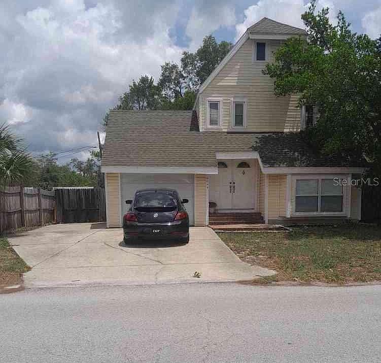 Great find! 3 story very unique home in a quiet residential neighborhood. Double door entryway. Foyer has stairs for upper level and step- down for main level. Large Great Room, Dining Room, Kitchen, Half Bath, inside Laundry Room on first floor. One Car Garage with entry through laundry room. Stairs leading to second floor with Master Bedroom, Full Bath with claw bathtub, walk-in shower and Second Bedroom. Third level has nice size loft with skylights and has been used as 3rd Bedroom with enough space for a work station. The Great Room has French Doors that lead to a screened in covered porch which opens to a wood deck and spacious, fenced backyard safe for play. This home is minutes from downtown New Port Richey, close to schools, shopping and public transportation.