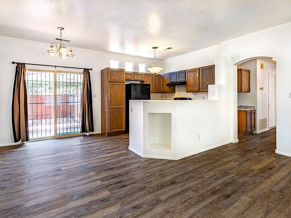 Welcome to this thoughtfully updated two-bedroom, two-bathroom home nestled on a desirable corner lot in Santa Fe's welcoming neighborhood. This single-level residence offers comfortable living with 946 square feet of well-designed space, perfect for those seeking a single level home with comfortable open floor plan. The heart of this home features a completely refreshed kitchen equipped with new appliances including a range, dishwasher, and refrigerator, complemented by new countertops. Throughout the home, you'll discover fresh interior paint, updated flooring, and modern light fixtures that create a bright atmosphere. Both bathrooms have been enhanced with new sinks and fixtures, while the recent installation of a new water heater and door hardware demonstrates the attention to detail invested in this property. The thoughtful updates extend beyond aesthetics to ensure long-term comfort and functionality. Outside, the fenced backyard provides privacy, while the spacious layout offers plenty of room for gardening or simply enjoying New Mexico's beautiful weather. The covered patio creates an ideal outdoor living space and the convenient shed provides storage. A one-car garage adds practical appeal for vehicle protection and additional storage. The location offers excellent convenience with Rancho del Sol park just steps away, providing recreational opportunities and green space. Best of all, there are no homeowners association fees, giving you the freedom to enjoy your property as you choose. This move-in ready home combines modern updates with comfortable living in a prime location. Please see the 3-D Matterport in the listing!