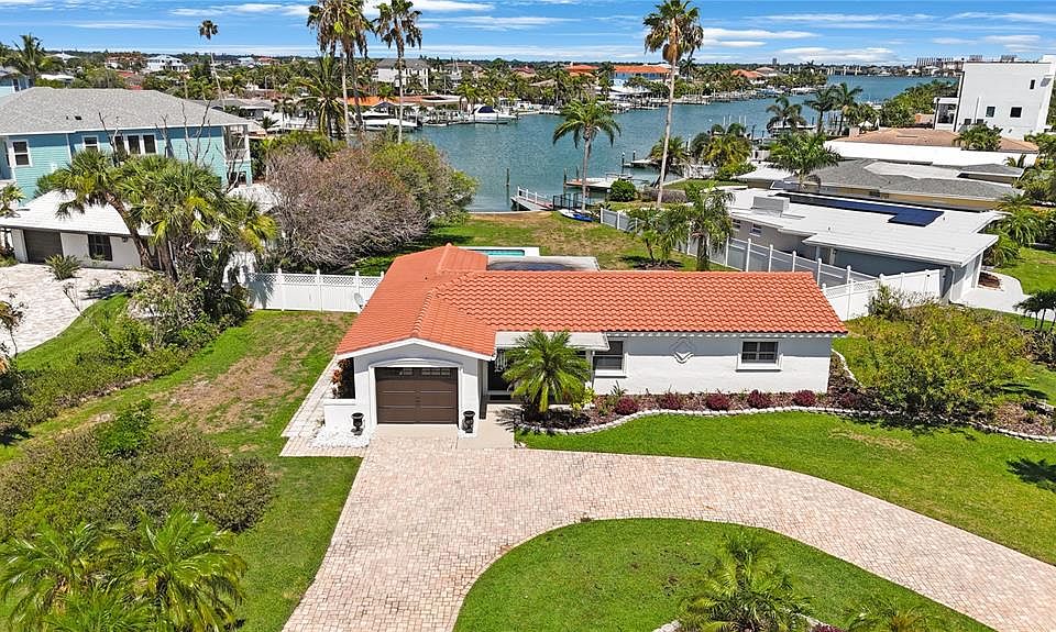 WELCOME TO PARADISE on the highly desirable Isle of Palms in Treasure Island, Florida! This stunning, renovated, and lovingly cared for solid block pool home is situated on over a quarter of an acre and offers a luxurious beach lifestyle with its prime location on the intracoastal waterway. Featuring 3 spacious bedrooms and 2 full bathrooms, this home provides ample space for family and guests. The open concept living area seamlessly connects the living, dining, and kitchen featuring custom cabinetry and range hood, new stainless steel appliances and a large Blue Celeste Quartzite island/breakfast bar with incredible views from every angle, creating a bright coastal airy environment perfect for entertaining and everyday living. The split floor plan ensures privacy with the primary suite separated from the additional bedrooms. Enhancing the home’s aesthetics are the beautiful French doors from both the primary suite and second bedroom, and sliders leading out to unparalleled intracoastal views and ample inviting outdoor spaces. Once you Step outside you will find your sparkling oversized private waterfront pool, ideal for cooling off on hot Florida days and entertaining friends and family. Enjoy serene views of the intracoastal right from your backyard, with easy access for boating and water sports from your private dock. Whether you’re lounging by the pool, hosting a barbecue, soaking in the scenic views, you can conveniently paddle out to the John's Pass sandbar for a day of fun or shoot out to fish or tube in mere minutes with no fixed bridges straight out to the Gulf! Grab your beach bag and take a short stroll to the powdery sands of Treasure Island Beach, or walk the boardwalk and soak in a local band at sunset. This home also includes a garage for convenient and secure parking, along with additional storage for all of your beach gear. One of the largest lots in Isle Of Palms, the possibilities with this property are endless. Don’t miss this rare opportunity to own a piece of paradise for an unbeatable price in Treasure Island. Schedule a viewing today and experience the best of Florida living! This home is being offered partially furnished with all of the furnishings to go along with it (buyers choice)! 2019 AC, 2024 water heater, 2011 (50 year) tile roof! *6,000LB BOAT LIFT CAN BE ADDED!*
