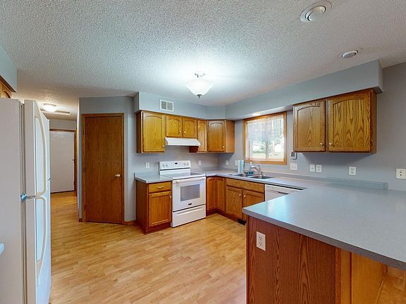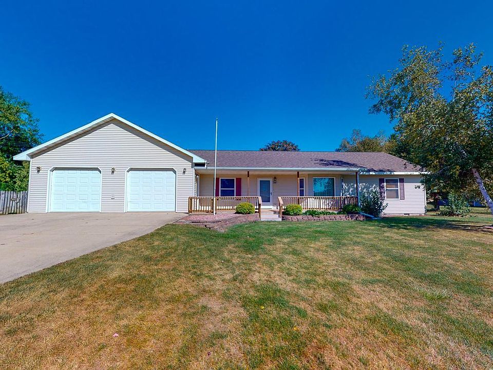 Spacious ranch style home with nearly 1,500 sq. ft. on a poured foundation. This well maintained, zero-entry home features main floor living, beautiful front porch, 2 bedrooms, 2 baths, an open layout, appliances, central air, deck and maintenance-free exterior. Den or office room could be turned into 3rd bedroom. Recent improvements include roof, carpet and vinyl flooring. Two car garage (1,120 sq. ft.) features a heated enclosed work area, finished stall and small overhead utility door out the back. Dog kennel offers 3 separate and covered runs that could be easily converted to a shed. Located in a rural setting on a half acre lot along a dead-end street. Pre-inspected!