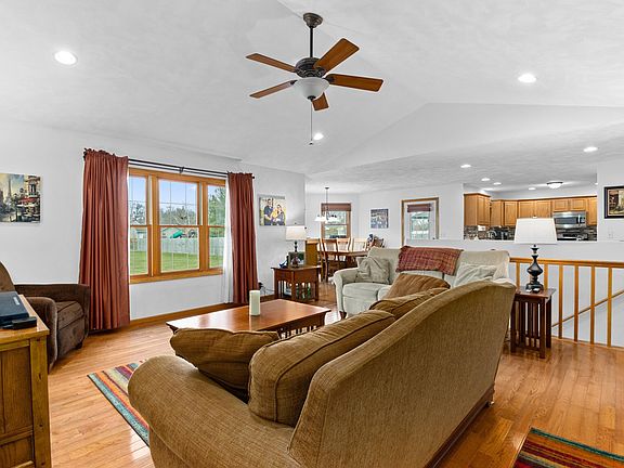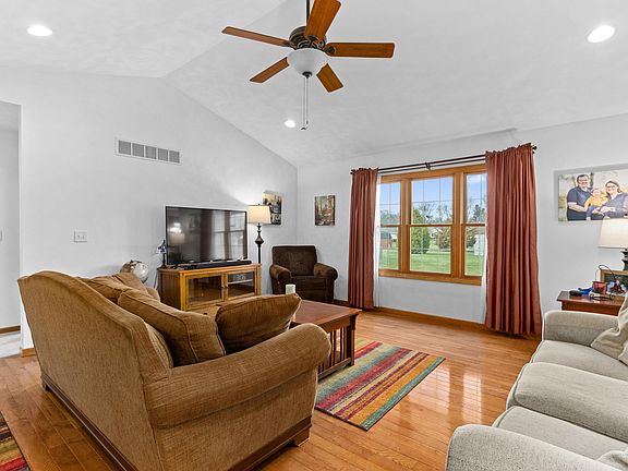 Updates include Roof (complete tear off), carpet, finished basement, water heater, composite deck, blown-in insulation above garage & garage door opener. Beautiful 3 bedroom / 2 full bathroom ranch style home w/ finished basement & master suite! Great room features vaulted ceilings, stunning wood floors & opens to kitchen w stylish backsplash, stainless steel appliances, pantry, tons of counter top space & ample cabinetry. Entertain in the informal dining area that leads to composite deck over looking fenced in 1/2 acre lot. Primary suite w/ walk-in closet, primary bathroom & new carpet. In addition, 2 spacious bedrooms, both w/ new carpet & one w/ vaulted ceilings. Basement showcases family room, play area, gaming area & storage area. Basement is plumbed for 3rd full bathroom. Oversized 2 car garage! Main floor laundry!