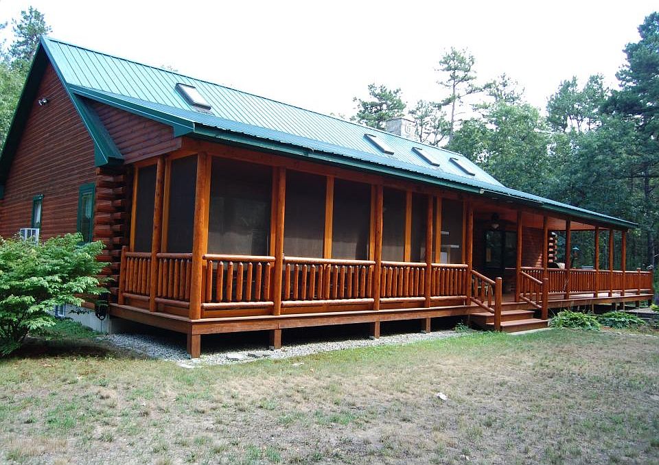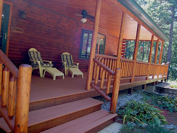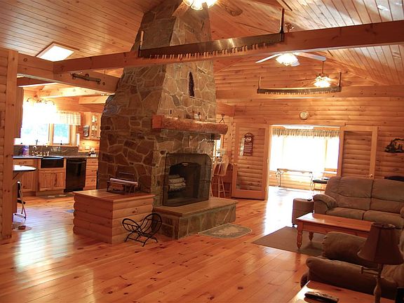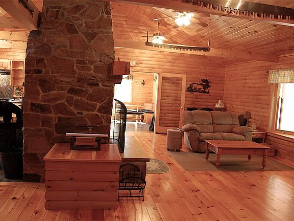 Stunning log lodge designed as 1 bedroom for happy empty nesters can easily be a 2-3.This 72 foot ranch style impeccably maintained custom home with every imaginable amenity is the dream home of local couple. Fabulous weekend getaway or year-round .5 mi. from private airport. Set well back from asphalt country road on 53.8 ac, long frontage acres. Laced with wide well cleared vehicle width mulched paths perfect for horses, ATVs, X-C skiing, birdwatchers,hunters&sportsmen. One of several ponds stocked with trout in the past then cleared for family ice skating. Over $500K in buildings alone. Soaring 2-story stone fireplace centerpiece of open plan. Granite & tile kitchen with custom storage & new high-end pellet stove. Dumbwaiter delivers pellets from the full basement. Open flow perfect for entertaining. 966 sq. ft. of deck! Sun-room with wet bar. ADA master bath. 20x20' master bedroom.. Matching 3-stall double height garage with power, water, drains, screens &stove. RV pad with power & water.