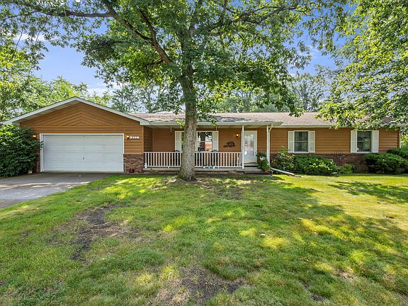 This cozy brick and cedar ranch is nestled on wooded corner lot within walking distance of town! A covered front porch welcomes you into a HUGE living room for entertaining guests. The dining area offers access to the sunroom via french doors. This is a great spot for that morning coffee! The kitchen comes with all appliances and has an L shaped snack bar. Bedrooms 2 & 3 share a full bath while the primary bedroom has a 3/4 bath and walk in closet. The laundry room has a sink, 1/2 bath , and storage cabinets. The oversized attached garage features a nice bump out workshop area with work benches. Outside you'll find a storage shed for the toys. This home has been well kept and maintained over the years with a new roof in 2011 and new furnace, Hot water heater and A/C in 2016.