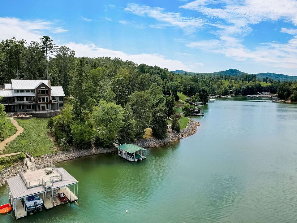 Lakefront living at its best with close proximity to downtown Blue Ridge ! Extensive lake frontage gives clear Breathtaking Lake and Mountain views. Custom built by GGreenG builder with extreme attention to detail. Placed on the 1.5 acre lot to allow for privacy and best views from almost every room. From the floor to ceiling windows to the floating staircase everything was done to maximize the stunning views. Great room w/stacked stone fireplace, soaring ceiling open to the chef's kitchen complete with large pantry, center island with prep sink,6 burner gas stove and double ovens. Screened patio off the kitchen, large main deck off the great room, separate deck off the master. bedroom on the main. 3 bedrooms, loft & 2 baths upstairs. Walk out terrace level great room has fireplace & bar. 1 bedroom 2 baths & large bonus room which is used as the 6th bedroom. Paver patio w/room for a Jacuzzi, has electric, & custom fire pit. Single slip dock for a 24 ft boat, 6000 lb lift, 2 Jet Ski ports, electric, water & party deck on top. Very low maintenance. Hardie board GCement sidingG Geothermal Heating and A/C system. Heats & Cools from the lake., Fast Fiber Optic WiFI, 50 yr Aluminum roof, Trex decking & low maintenance landscaping. Making this a perfect vacation home or Airbnb. No restrictions and you can easily sleep 16 or more.