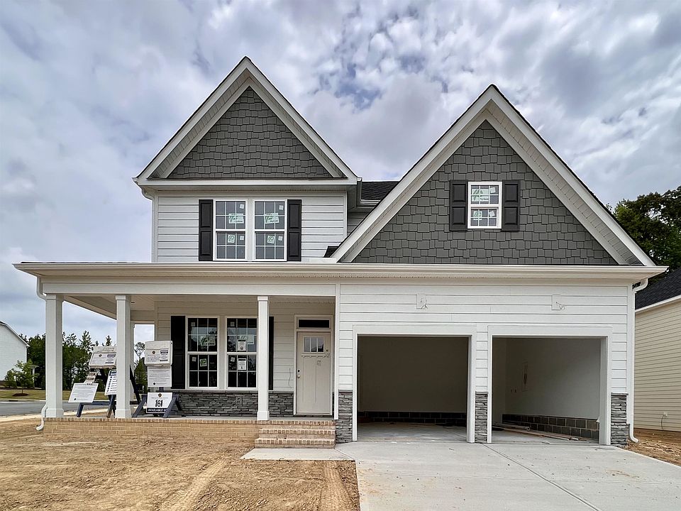 FIRST FLOOR MB! New BUILDER in GG. Ext. front w/partial stone, wrap around front porch, Cvd. back porch. Gorg. laminate floors on main floor. Stunning, dark grey kitch. cabinets, quartz tops, tile backsplash, SS appliances & island. Formal dining with trim and coffered ceiling, accent wall. MBath w/sep. tub/shower, quartz tops, tile floors. 1st floor: Master bedroom, large open family room w/ high ceilings, gas log FP w/ slate surround. 2nd floor: 3 additional bedrooms and loft. Pool community w/tot lot, clubhouse, walking trails.