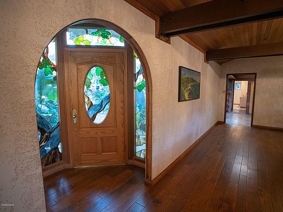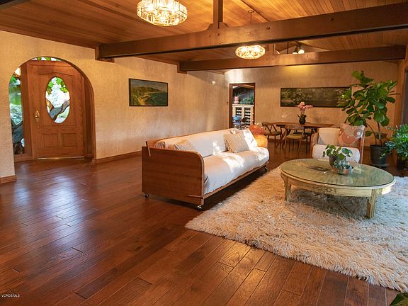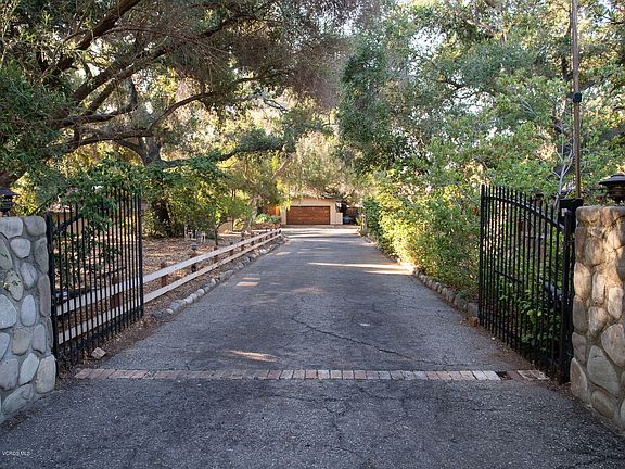 A hideaway on an oak shaded property, just blocks from downtown Ojai. This 3 bedroom and 3 bathroom home is gated at the street, and is a private and serene parcel with an ensemble of buildings.The property features a single story home ideally situated to enjoy a bounty of nature.This desirable location enjoys close proximity to restaurants, markets, bookstores, coffee shops,a park with a playground and public tennis courts. The main house has high ceilings and exposed timber framing with reclaimed redwood in grand rooms. The Master Suite is large with a spacious walk-in closet, bathroom, and a beautiful view of the curving deck. The deck wraps the back of the house and combines koi pond, a barbecue area and appealing outdoor dining terrace. Look out over the seasonal creek area already fenced for a horse ,a place for chickens or other animals all with a view of the mountains. Other structures on site include a one bedroom GUEST HOUSE with kitchen and bathroom,a detached 2 car garage, and three storage barns and a small workshop. The entry is lush with beautiful ponds and garden elements and was featured in three Ojai garden tours. Solar panels, A.C. and central heating for the warm summers and cool winters. Come see this one of a kind property!