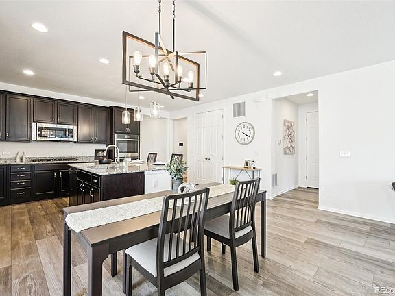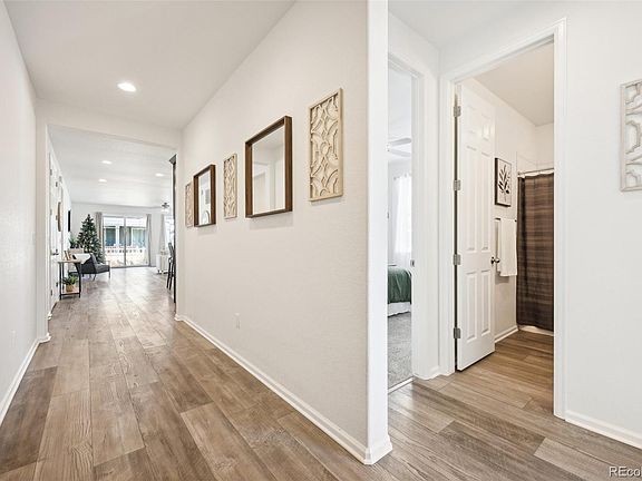 The primary bedroom is a true retreat with its ensuite bathroom, offering double sinks, a spacious walk-in shower with custom tile, and a large walk-in closet. Two additional bedrooms, a full bathroom, and a roomy laundry room with a utility sink complete the main floor. Downstairs, the finished basement offers a large rec room wired for surround sound and a projector—perfect for movie nights. There are two more spacious bedrooms bath, plus an area that can be transformed into a kitchenette or wet bar. Storage is plentiful throughout the basement, and the two-car garage has additional space for tools, toys, or more storage. Built with upgrades such as extra windows, a larger island, and fiber connectivity, this home is modern and convenient. Additional perks include a tankless water heater (installed in 2023), a Vivint Security System with all equipment, and a Rain soft EC5 Series Water Filter System. Two blocks from the Venture Center/Pool and three blocks from Padilla Elementary School, the neighborhood offers easy access to I-76, Hwy 85, Hwy 7, and E-470, plus shopping, Barr Lake, and more. Only 20 minutes to DIA and 25 minutes to Denver—Brighton Crossing truly has it all!