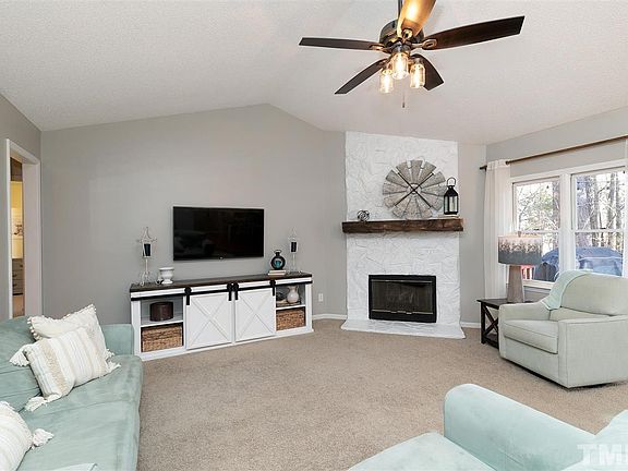 Rocking Chair Porch welcomes you to this Ranch Style 3 BR home located in a Cul-de-sac. Vaulted Ceiling in Family Room has a Stone fireplace w/gas logs. A Bright Kitchen w/Open Shelving. Large Owner's Suite w/extra touches that include Built-ins, a Window Seat & a Barn Door. Both Baths updated w/new Tile,Vanities,Flooring & Fixtures. Decking above & below in a fenced Yard. Storage includes 12x8 Shed w/power & Walk in Crawl Space. This home has all the Charm! Easy access to Raleigh, I-40 & Shopping.NO HOA