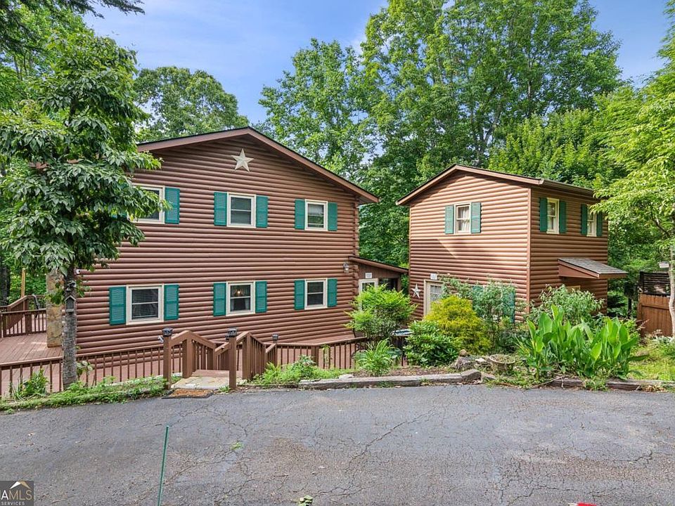Welcome to your dream retreat in the heart of the North Georgia mountains! Nestled within the highly sought-after Walnut Mountain community in Ellijay, GA and being offered completely TURN-KEY/FURNISHED, this stunning 3-bed, 2.5-bath log cabin offers unparalleled mountain views and the perfect rustic charm. As you approach the property, you'll be captivated by the serenity and inviting curb appeal of this meticulously maintained cabin. You'll first step into the bright and newly finished sunroom and then inside to discover a warm and welcoming living space featuring rich wood accents and a cozy stone wood burning fireplace. The main level also boasts a well-appointed kitchen, complete with stainless steel appliances, granite countertops, a breakfast nook/dining area, a half bathroom with laundry, and access to the expansive wrap-around deck where you'll be mesmerized by mountain views. This outdoor space is perfect for entertaining guests/family, sitting by the fire, or simply relaxing. The upstairs features all 3 bedrooms and 2 bathrooms and a second deck allowing you to keep soaking up the natural beauty that surrounds. The delights don't end here; a second two level building adds incredible value and versatility to the property. This space is newly constructed and includes a wet bar with an apartment sized fridge and cozy living room, while the upstairs highlights a game room with a kids bunk. This cabin has so much to offer and would be perfect for full-time living, mountain getaways, or an investment as a short term rental. Walnut Mountain also ensures that outdoor adventure is always at your fingertips, with amenities such as nature trails, lakes, a campground, a tennis court, a swimming pool, and many more. Plus, you're a short drive to downtown Ellijay, renowned for its charming shops, restaurants, and vibrant local culture. Don't miss your chance to own this exceptional mountain retreat - it's not just a home, it's a lifestyle!