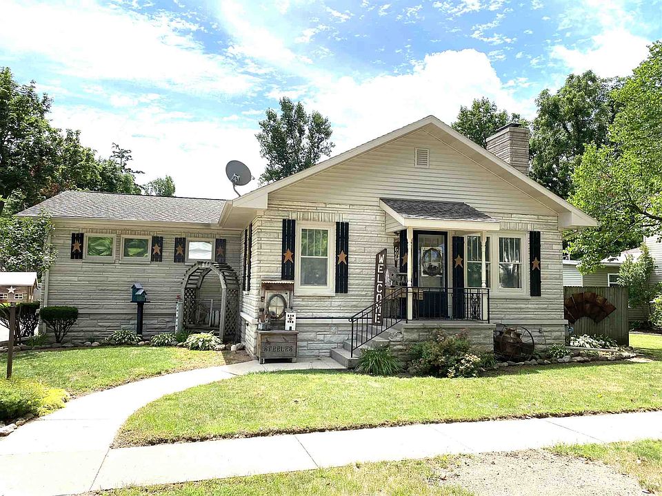 Price Reduction!!! Step into this well built stone home that was constructed for the ages. You will find a large living room with tall ceilings and an electric fireplace (can be wood burning). A bright kitchen with cabinets reaching the ceiling adjoins a breakfast nook overlooking the back yard. The spacious primary bedroom has vast built ins and a connected full bathroom. The home has one additional bathroom and two additional bedrooms each with large closets. Hardwood flooring is present under the carpet in the bedroom and the living area. Wall storage and closets are abundant throughout the home. The family can enjoy a partially finished basement with attached bar area. Also another full bath (that makes 3 full baths!) and a large laundry room. A two car garage, 2 sheds, and a playhouse/potting shed are all included. With new roof, windows, soffit, gutters, and vinyl siding you will have only entertaining to do outside on the concrete and fenced patios. You will appreciate the craftsmanship of this home! Come take a look!