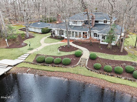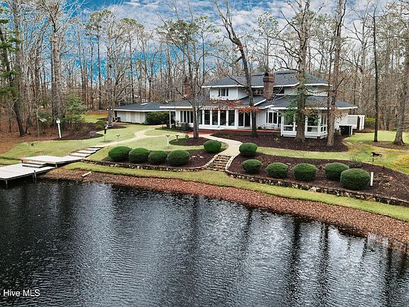 This CUSTOM BUILT 4 BR/4BA estate offers unparalleled privacy and tranquility on 5 acres, just minutes from ECU HEALTH MEDICAL CENTER and shopping. A circular driveway welcome you to this 4550 sq. ft. home. featuring premium finishes, vaulted ceilings, hand-hewn beams, heart pine flooring, and thermal windows & doors. The main level includes a spacious primary suite with a spa-like bath featuring a walk-in tile shower, soaking tub, double vanities, and two large walk=in closets. It features a glassed in porch and a LIBRARY/STUDY that offers a gas log fireplace, built in bookcases, and a custom desk. The CHEFS KITCHEN is designed for entertaining, featuring QUARTZ COUNTERTOPS, A TILE BACKSPLASH, A KITCHEN ISLAND WITH COOKTOP AND STAINLESS STEEL APPLIANCES. The home offers multiple living spaces, including a SUNROOM with BRAZILIAN CHERRY HARDWOOD FLOORS AND STUNNING LAKE VIEWS, AND A SEPARATE LIVING ROOM WITH A CUSTOM MASONRY FIREPLACE and a FORMAL DINING ROOM with a CEILING MEDALLION, PANELED ACCENT WALL, AND BUILT IN CABINETRY. Upstairs features THREE ADDITIONAL BEDROOMS, including one with a PRIVATE ENSUITE BATH and two sharing a JACK-AND-JILL BATH. A SPACIOUS SITTING ROOM WITH BUILT-IN SHELVING AND WORKSPACE completes the upper level. Connected to the main house by a breezeway, a DETACHED 592 SQ. FT.L ACCESSORY DWELLING UNIT is perfect for a GUEST HOUSE, IN-LAW SUITE, OR RENTAL OPPORTUNITY, offering a