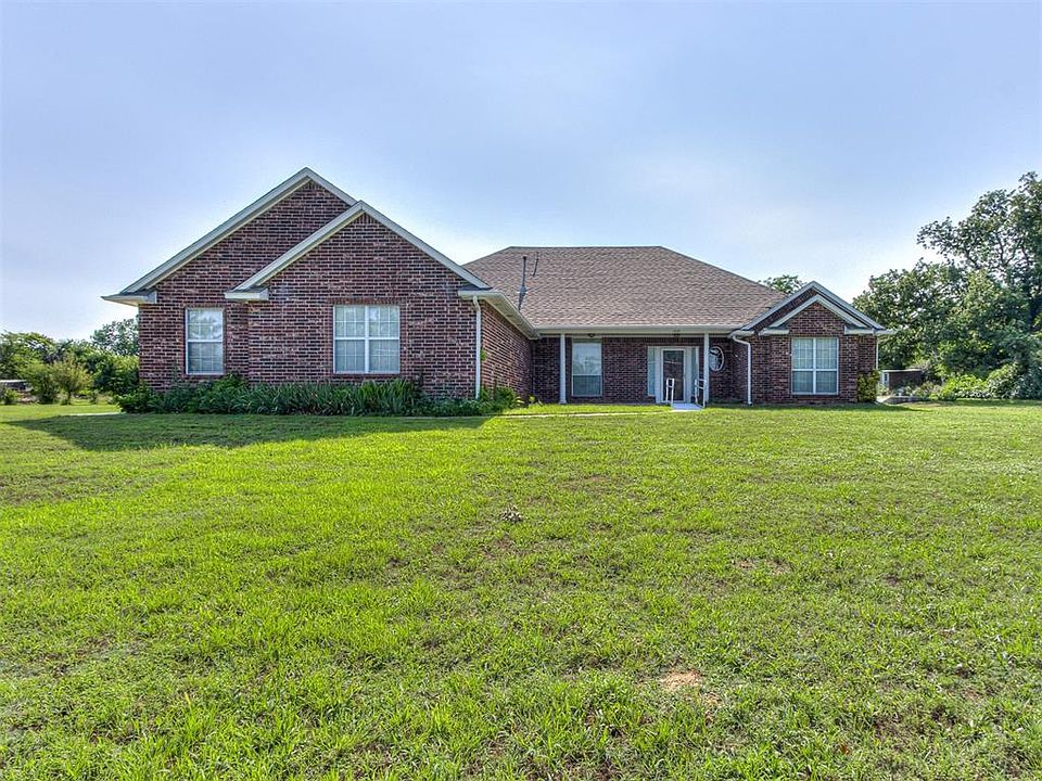 Welcome home! You'll love the look of this classic brick exterior on a beautiful, spacious, green over 1.5 acre lot, complete with a separate storage building. This 2,423 sq ft, 3 bedroom, 2.1 bathroom, home has ceiling fans throughout, a formal dining area, office, and a charming brick fireplace in the living room. The kitchen has ample cabinet space with under cabinet lighting, a gas range and oven, refrigerator, dishwasher, and a charming breakfast area, not to mention a gigantic pantry! The primary bedroom has lots of natural lighting, a bathroom with double vanity, soaker tub, and a very roomy closet with built in shelving. Laundry will be made convenient in the utility room with a sink, counter space, and cabinet storage above and below.