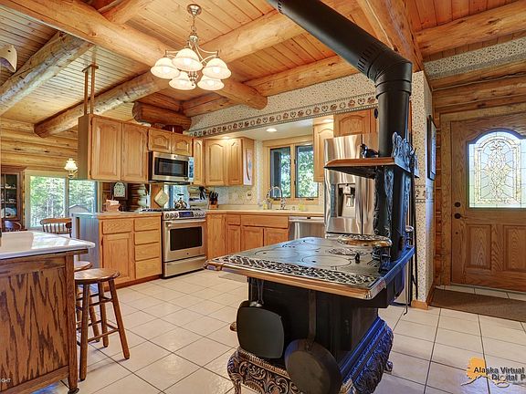 Stunning log home privately set in the middle of five acres, with beautiful views of Pioneer Peak and the Chugach Range. Home has been updated with new triple pane windows, new roof, remodeled bathrooms new dormers, and an automatic back up gas fired generator. There's beautiful 3/4 inch T&G real cherry wood floors, tile flooring in the kitchen and bathrooms, all new decking and so much more. The