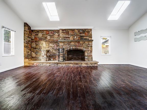 Private backyardFresh paintRock fireplace wallLarge windowsCute deckNew vinyl flooring