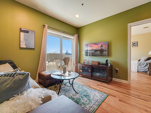 Beautiful east-facing 2 Bed / 2 Bath condo in an elevator building with one deeded parking! Enjoy your private balcony with Manhattan views which you can access from both the spacious living room and bedroom. The large sliding doors also flood the unit with bright, natural lighting. The primary bedroom has tons of storage and en-suite bathroom with tile flooring. Recently renovated hardwood flooring throughout and washer dryer in unit! Conveniently located in the heart of Union City just a few blocks from Washington Park, shops, restaurants, transportation to NYC and more!