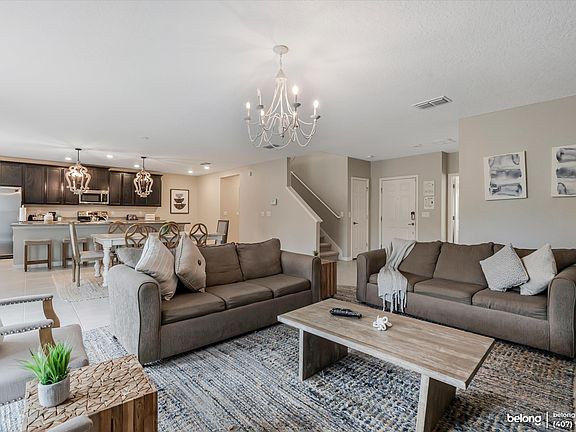 *While the home may be furnished during your tour, it will be listed and available as unfurnished. This stunning 4-bedroom, 3-bath craftsman-style home in Davenport captivates from the moment you arrive. The lush front lawn enhances the home's curb appeal, while the welcoming design invites you to explore further. Sunlight floods the spacious living room through expansive glass doors that offer a picturesque view of the backyard with a sparkling pool and distant trees. It's the perfect setting for both relaxing and hosting gatherings. The kitchen is a chef's delight, featuring recessed lights, abundant cabinet space, and sleek stainless steel appliances. A large center island with elegant pendant lighting adds style and practicality, making meal prep a pleasure. Retreat to the primary bedroom upstairs, where you'll find a spacious walk-in closet and contemporary-style ensuite bath with a dual sink vanity and a step-in shower with full tile walls. Three other bedrooms provide ample space and privacy for the whole family. Conveniently, the laundry room comes equipped with both a washer and dryer, simplifying daily chores. Outdoors, the private pool and patio truly steal the show. Whether you're hosting a summer barbecue or enjoying a quiet evening by the water, this area becomes the heart of your home. An attached garage, complete with finished walls and floors, accommodates two cars but is also versatile enough to transform into a game room or extra space for hobbies. Ideally positioned near Champions Gate Golf Club and Disney World, this home places shopping, dining, and entertainment just a short drive away.