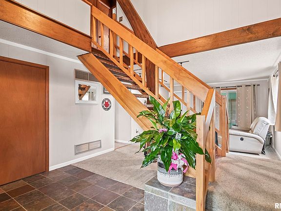 Stunning a-frame style home with 3 bedrooms & 3 full baths! Stepping inside, you'll be greeted by the gorgeous open staircase & soaring ceilings, as well as eye-catching woodwork throughout! Step up into the family room featuring a floor-to-ceiling brick wood-burning fireplace, wood built-in shelving, a wall of windows, & a stunning wood-covered vaulted ceiling. Also on the main level is a living room with glass doors leading to the sunroom, kitchen with tiled backsplash & flooring, large dining room with breakfast bar for ample seating, dry bar area featuring an exposed brick wall & office space, as well as a full bathroom & laundry area. Upstairs you'll find a gorgeous den with another brick wood-burning fireplace, & stunning overhead views of the family room & foyer, loads of woodwork & built-ins, a ladder to the 3rd story 7x5 nook/loft space, & all 3 bedrooms. The large primary suite features hardwood flooring, two closets, & an ensuite with dual vanities, a corner shower, & a large soaker tub for relaxing! 2 additional bedrooms & 3rd full bath are on the other side of the den area, offering a split-concept & privacy! Home also features a brand-new roof (Sept. 2024), dual HVAC systems, fully fenced yard - front & back, large rear deck, a storage shed, 2-car garage with rear alley access, & a concrete parking slab. Partial basement with numerous crawl space areas offers plenty of additional storage space.
