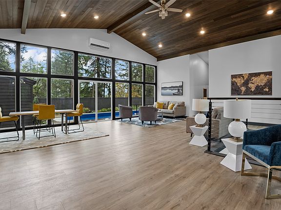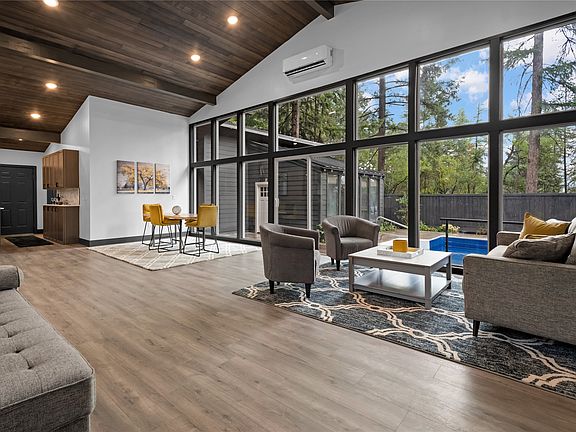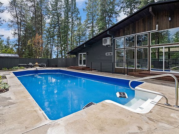 Midcentury modern home in quite and coveted Whitefish neighborhood, just a 5 minute walk to City Beach and downtown Whitefish. Beautiful inground pool in the backyard can be enjoyed year round and has an adjacent pool-side sunroom. Teak siding and three redwood decks compliment the outdoor living experience. The main floor includes vaulted cedar ceilings in the great room with expansive floor to ceiling windows, a spacious and well designed kitchen, the primary bedroom, second bedroom, laundry and an additional bathroom. The fully finished walk out lower level includes bedroom 3 and 4, a second kitchen, a second living area and an additional laundry and bathroom. Radiant floor heat in all bathrooms. Complete renovation in 2023 includes new framing, electric, plumbing, high efficiency HVAC , insulation, appliances, pool liner, fencing, decks and more. Furnishings negotiable. Please call Carrie Vine at 406-270-0206 or your real estate professional.