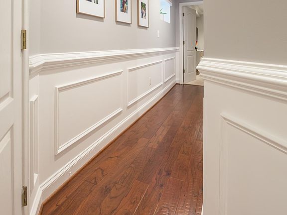 Hallway, living room, and dining nook have hardwood floors and stylish wainscoting trim.