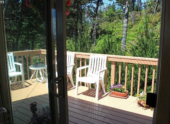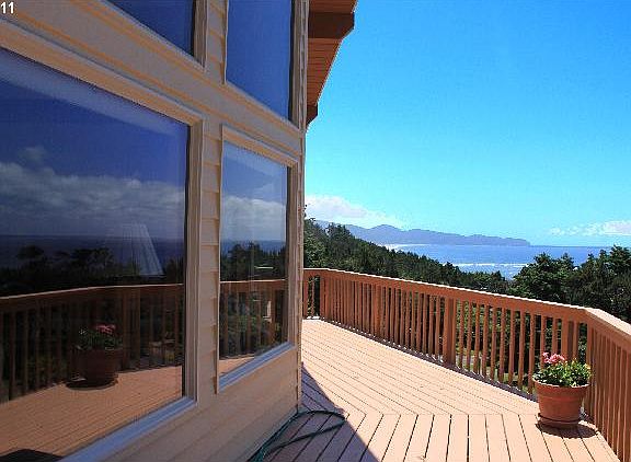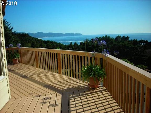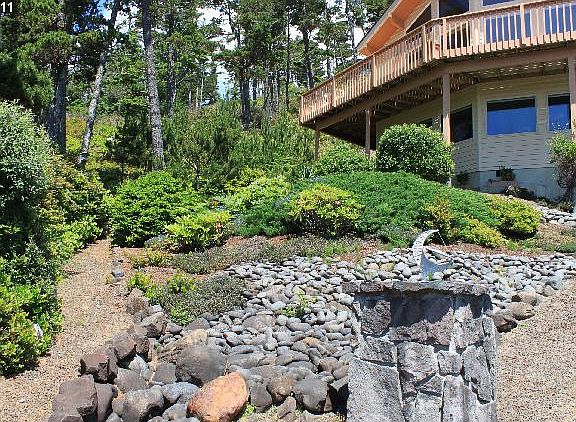 Custom built home on private road in Premier Neighborhood! Panoramic close-up ocean views with wrap around deck. Open floor plan w/ vaulted beam ceiling, massive natural stone fireplace, custom cabinetry w/ tiled kitchen island, 3 bedrooms, 3 full bathrooms on main level. Jetted tub in Master Bathroom. Elevator access in oversized double car garage w/ built in storage. Beautiful natural wooded surrounding on .29 of an acre.