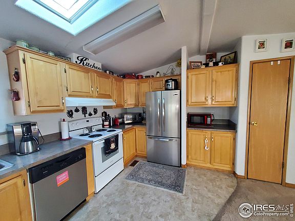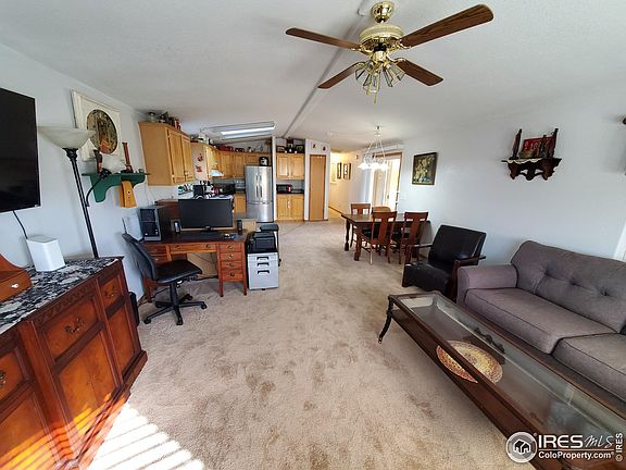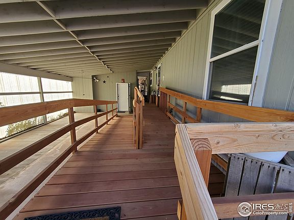 Back on the market through no fault of home! Beautiful home in a beautiful park. This home has a large living room which you can see the Colorado Mountains from! 2 Bedrooms, 2 Baths and a 3 season enclosed porch that you will love. The kitchen is equipped with Refrigerator, Dishwasher, Electric Stove/Oven, gorgeous wood cabinets & plenty! A great pantry too!! Primary Bedroom has a walk-in shower with grab bars and seats. The 2 car carport is just what you need! A handicap ramp in front with the option of stairs. 3 off street parking spaces and a huge lot! Beautiful garden area and back patio. Good size shed/workshop tops this home off! Don't miss this home! Senior living at its finest. Lot rent only $880.00 currently. Small dogs ok with park approval.
