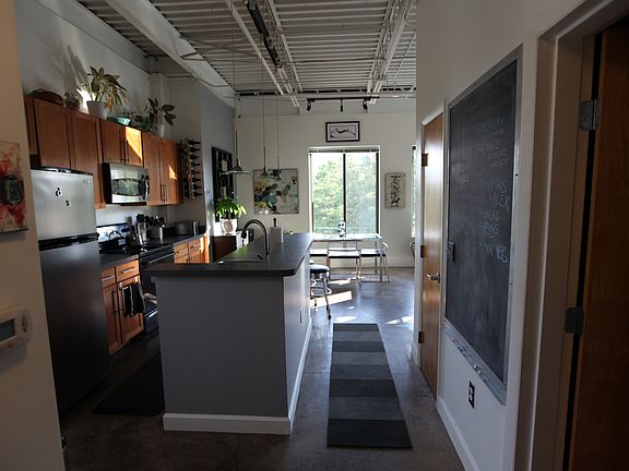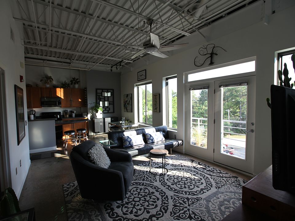 CARRBORO PENTHOUSE CONDO. Live in Downtown Carrboro. Walk and bike everywhere or ride free Carrboro/Chapel Hill bus. End unit condo. Open, modern floor plan with 11' industrial exposed ceilings, concrete floors, and oversized windows. Birch wooden doors. Weather check balcony. Covered, assigned parking under building. Elevator to secure third floor.New Heating Cooling system 2015. Recent building renovation, paint, new windows, trim and exterior Hardie siding replaced.