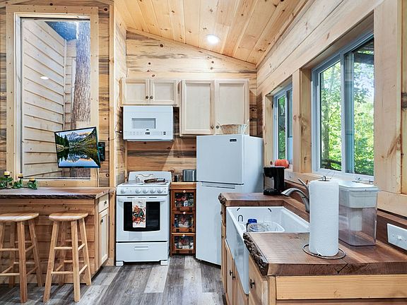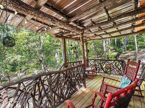 Unique, fully furnished treehouse retreat in the mountains of North Georgia. Savor stunning sunsets from this west-facing haven, perched above a serene babbling brook, waterfall, and pond. Nestled close to town yet offering ultimate privacy and seclusion, this authentic treehouse features trees growing through its core. Crafted entirely of wood with charming mountain laurel railings, it includes a convenient service elevator. Perfect as a one-of-a-kind vacation rental or private escape in the North Georgia Mountains.