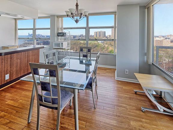 Spectacular Corner two bed on the top of the cliffs with scenic picture windows that wrap around your new home. Brand new kitchen cabinetry & granite counters, Large terrace of the open living and dining areas with hardwood floors throughout. NYC Bus, Ferry, Light Rail Shuttle at your door. Full service community that has fitness center, parking, pool, 24hr Doorman, updated laundry facilities, sauna & more.