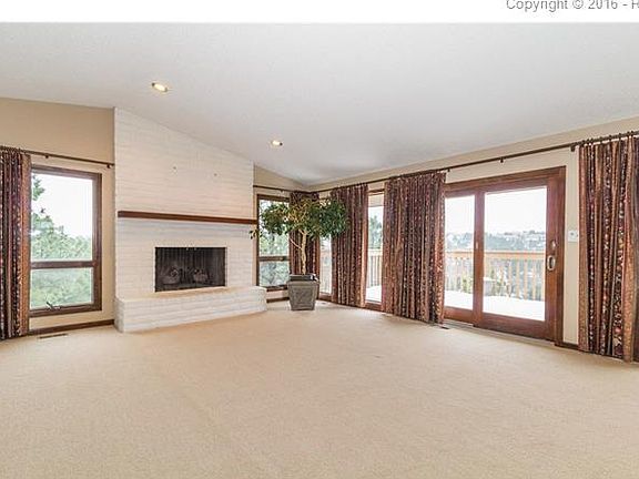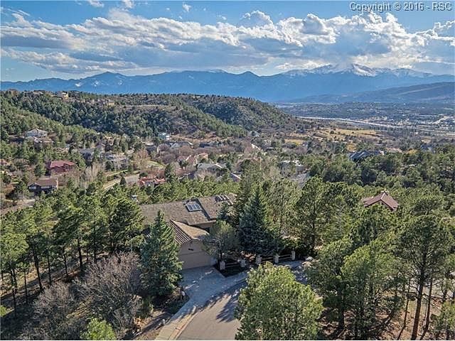 perched on the hill, boasting private .34 acre treed lot & unobstructed panoramic views. Being surrounded by the natural wonders of Colorado ignites your passion for the splendor of foothills living. The covered entry has stamped concrete walkway leading you to the front door. As you enter the great rm w/vaulted ceilings, relaxation & serenity overwhelm your senses, w/abundant natural vistas out every window. The floor to ceiling stacked brick fireplace anchors the room. New carpet & paint throughput the main level. From here you can walk-out to the deck & enjoy the timbered privacy & Pikes Peak view. The beautifully appointed kitchen boasts solid wood cabinetry, 4-burner gas range, stylish silestone counters, double ovens, wall pantry, tile backsplash, can lighting & tile floors. Dining nook & counter bar provides plenty of space for entertaining & for the formal occasions the separate dining room accommodates all your needs. Escape to the main level master suite boasting vaulted ceilings, walk-in closet & access to deck. The master bathroom has all the modern luxuries incl., soaking tub w/European style faucet, travertine tile floors/counter, & make up station. Downstairs you'll find 2 spacious bedrooms that share a newly remodeled full bath boasting concrete vanity & modern rectangle tile. Additionally the basement has an office w/ French doors & large open family room w/wet bar & custom built-ins, wood burning fireplace, water feature & walks-out to covered deck w/ hot tub. This home is loaded w/ upgrades including; light fixtures, 6-panel doors, remodeled main level 1/2 bath & many more!