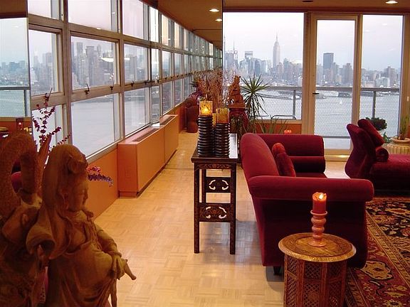 Penthouse Corner unit with a panoramic view of the Hudson River and the Manhattan skyline. From GWB to the Verrazano Bridge. Incredibly spacious living room and dining room, great for entertaining. A huge tiled balcony with breathtaking views. Master suite with large walk-in closet. Washer and Dryer included. Luxury doorman buidling with pool/gym. Hallways are newly updated in 2007. Transportation to NYC at your doorstep 24/7.