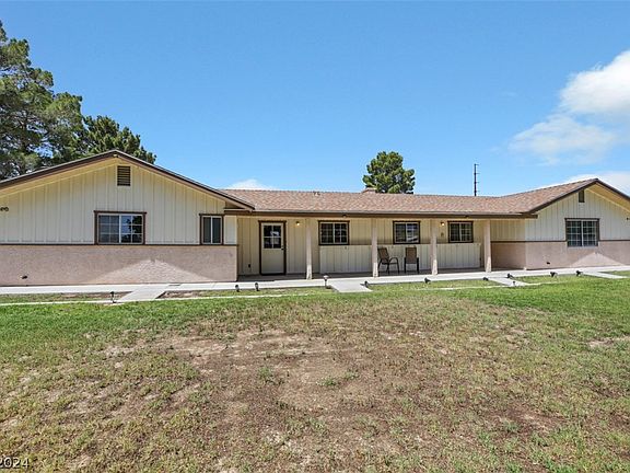 Charming 3 bedroom 2 bath country estate sitting on an acre of horse zoned property! The expansive front porch welcomes you to this one of a kind home with front views of Mount Charleston! Freshly painted interior features spacious rooms and a wood burning stove and custom built brick wood storage area and a wood beamed ceiling in the living room. Custom cabinets in the kitchen and all appliances stay! Huge laundry room and drop zone with built in cabinets with storage galore! The exterior back looks out onto BLM land (no neighbors behind you!) with views of the CA mountains! Custom built barn and separate storage shed both with electricity are perfect for the handyman or horse owner and barn could be converted to living space! RV hookups and a propane tank that can be hooked up. Private well water and dedicated garden area! This is your chance to own this special homestead with room to roam!