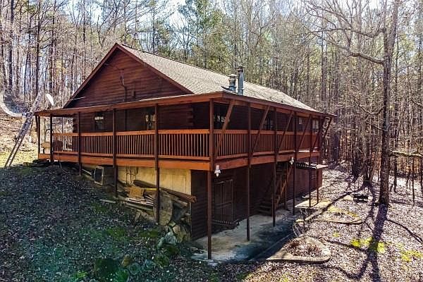 ACREAGE-- This charming log cabin is a gem hidden in plain sight! It sits on a 12+ acre private lot with breathtaking views of nature. The wrap-around porch greets you with southern charm and welcomes you into the main level featuring an open-concept kitchen that flows into a fireside great room. Access the spacious finished basement from the inside or exterior patio entrance and find another full bathroom, plus room for entertaining and/or storage. Neighbor allows access to fully-stocked pond!