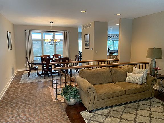 Beautiful 4BD/3BA home in Oakbrook at Tipton Lakes! Dramatic brick floors are featured in entry, dining, kitchen, breakfast, and laundry. Hardwood covers living, family, hall, and primary bedroom. Primary bath has quartz his and hers counters with custom porcelain tile and large walk-in shower. Primary suite has separate entrance to covered deck leading to patio below. Kitchen boasts quartz counters, GE Monogram oven and microwave, Jenn-Air gas cooktop, and Bosch dishwasher. Nine-foot ceilings are throughout main level, and new blown-in fiberglass insulation was added to entire attic in 2020. The 1200 square foot daylight basement includes finished large game room, full bath, and bedroom. Well-maintained yard features mature plantings and landscape lights in both front and back. With quality construction by Tom Hooker, home was featured in 1994 HOME-A-RAMA.