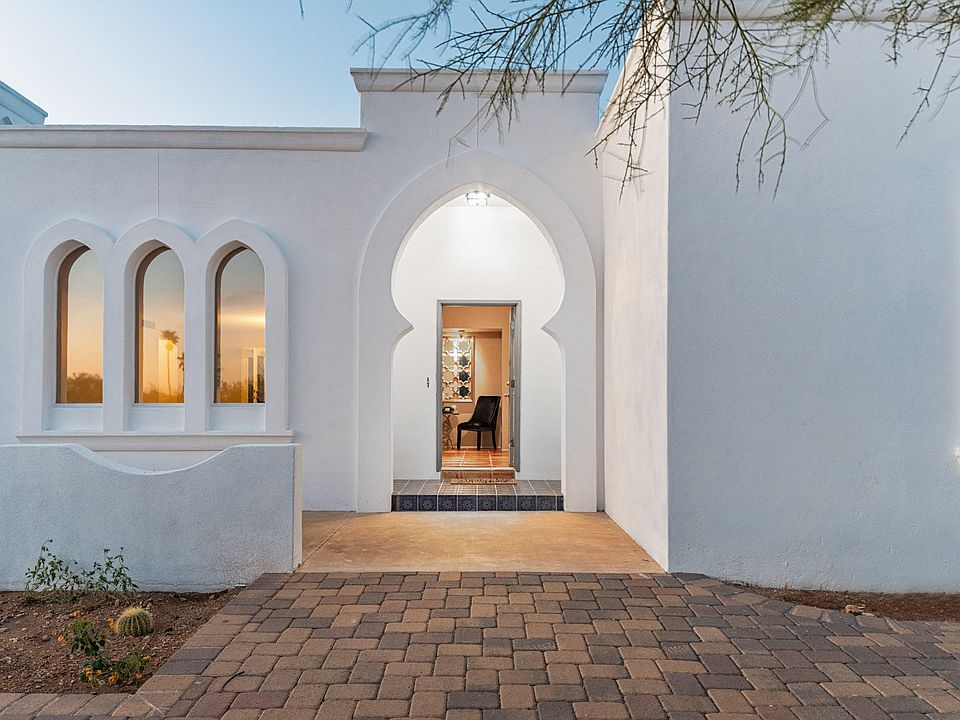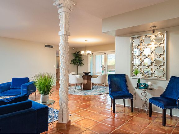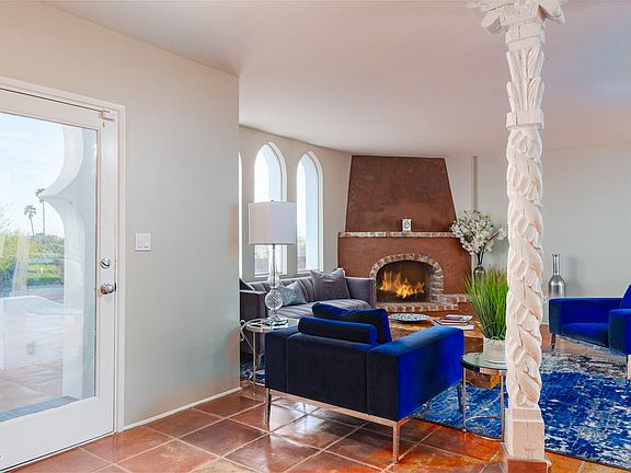 located at the top of the cul-de-sac, we have wonderful mountain views and city views. is a warm wonderful space. with 18" sq. saltillo tile through out, very private. the front facade is design with pointed arches all white stucco home with along wide driveway with beautiful; pavers that are highlighted by the desert landscape and the custom LED landscape lights which welcome you home as you arrive to the front entry. My house has 4 rooms, formal dinging, living, kitchen/family room. 3 bath rooms and 2 car garage. Our property has a wonderful back yard completely enclose with a modern design steel plate and stucco wall. this wall gives you privacy the unbelievable 18'x50' beach entry heated pool. An area set aside for gathering and elevated travertine pavers with a built in custom barbecue area with built in sink.