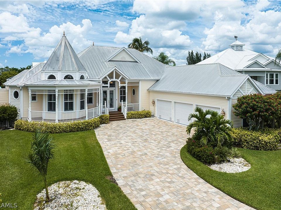 Stunning Gulf access estate located in esteemed Tidewater Island gated community. This beautiful waterfront home features Key West style architecture with a prominent wrap-around patio surrounded by lavish tropical landscaping. The home boasts a custom stone grotto pool and spa with electric heater, expansive paver driveway, spacious 3-car garage, open floor plan with magnificent volume ceilings, fenced yard, covered 10,000 LB boat lift with fish cleaning station, and fully-equipped outdoor kitchen. Coveted western exposure provides the perfect positioning for taking in breathtaking sunsets from the screened in lanai that overlooks the wide canal inlet waterway. The spacious eat-in kitchen includes an extensive walk-in pantry, granite counters, and ornate cherry cabinetry. All windows in the home are dressed with clean and elegant plantation shutters. Electric hurricane shutters were added to the back of the home and front door in 2014. The Tidewater Island community consists of only 58 homes, providing a close-knit neighborhood environment.