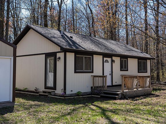 Nestled in the Lake of the Pines community, this beautifully updated three-bedroom home offers comfort and adventure. Set on a spacious wooded lot, it has a 924-square-foot pole barn for storing all the gear you'll need to enjoy Doc and Tom Lake. The exterior has been upgraded with a brand-new roof, fresh paint, and professional landscaping. Inside, you’ll find new flooring, a hot water heater, a well pump, a modern kitchen sink & countertop, updated lighting and ceiling fans, a new toilet, and fresh interior paint. The primary bedroom enjoys direct access to the full bath, while the two additional bedrooms sit on the opposite side of the living room, providing privacy and space for all. Step onto your scenic deck and take in breathtaking woodland views—perfect for unwinding and watching nature. Beyond your doorstep, the Lake of the Pines Association offers incredible amenities, including lake privileges, an outdoor pool, disc golf courses, a campground, fishing opportunities, a sandy beach swim area, and snowmobiling trails. Whether you're seeking relaxation or endless adventure, this home is ready to welcome you. Don’t miss out—your lakeside retreat awaits!